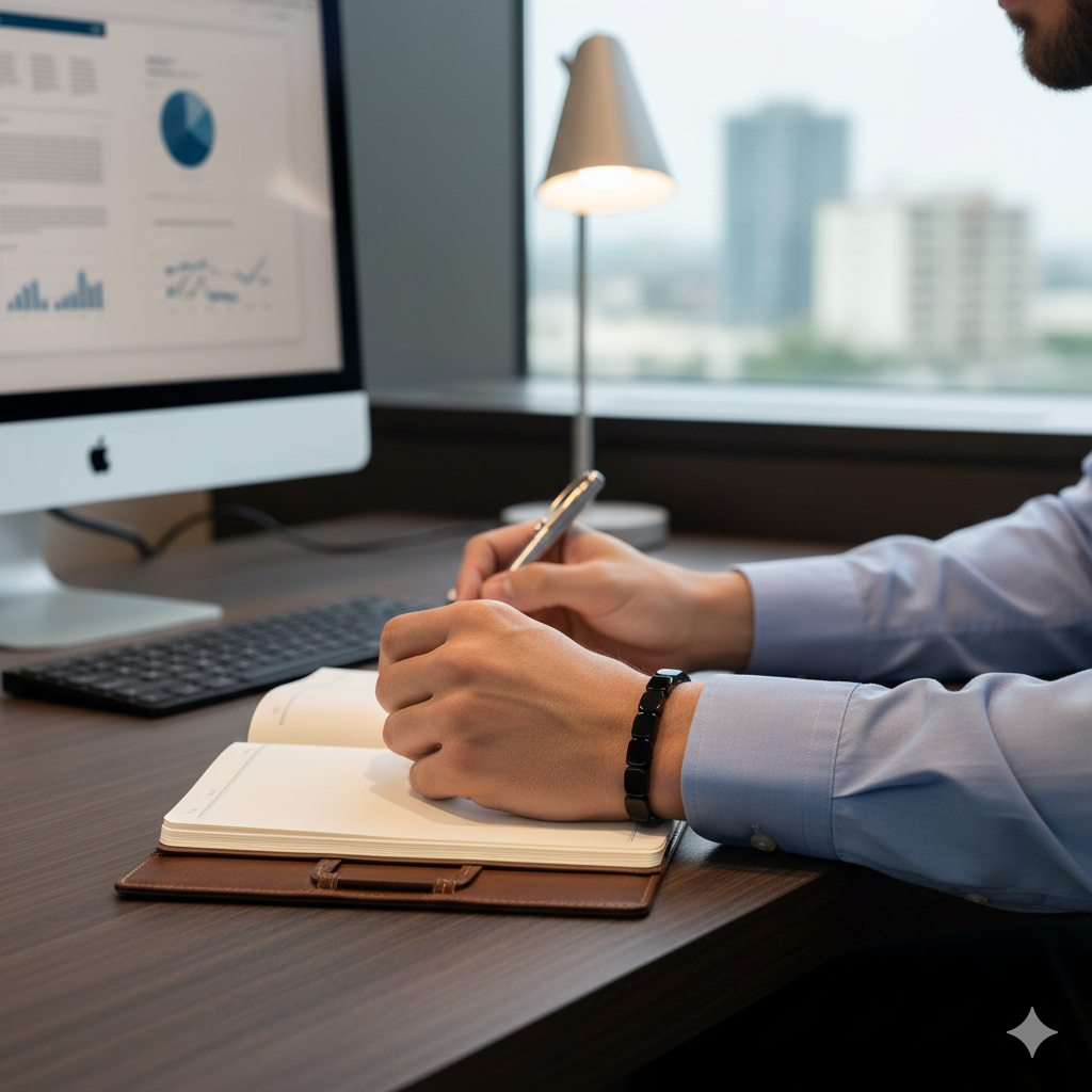 Worn daily, it connects seamlessly with your body's natural energy — helping sustain focus, drive, and vitality without the highs and lows of supplements.